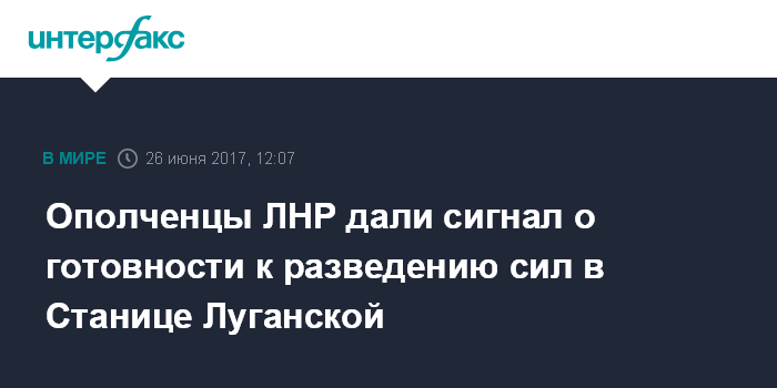 Москва. 26 июня. INTERFAX.RU - Ополченцы самопровозглашенной Луганской народной республики дали сигнал о готовности Народной милиции ЛНР к разведению сил и средств в районе Станицы Луганской, передаёт в понедельник корреспондент "Интерфакса".