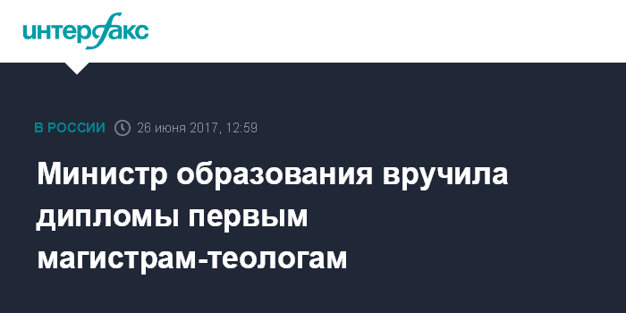 Москва. 26 июня. INTERFAX.RU - Министр образования и науки Ольга Васильева вручилав выпускникам Общецерковной аспирантуры и докторантуры им. святых Кирилла и Мефодия (ОЦАД) дипломы магистро по направлению "теология".