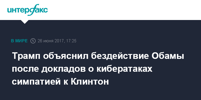 Москва. 26 июня. INTERFAX.RU - Президент США Дональд Трамп заявил в понедельник, что отсутствие реакции экс-президента Барака Обамы на информацию о возможном вмешательстве РФ в президентскую кампанию в Америке было вызвано его уверенностью в победе кандидата от Демократической партии экс-госсекретаря Хиллари Клинтон.