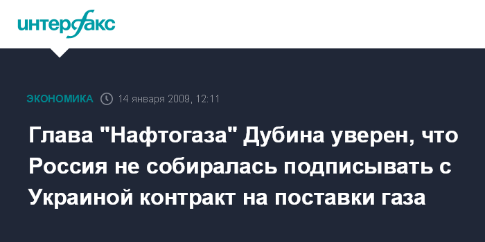 Москва. 14 января. INTERFAX.RU - Глава НАК "Нафтогаз Украины" Олег Дубина уверен, что Россия не собиралась подписывать с Украиной контракт на поставки газа в 2009 году.