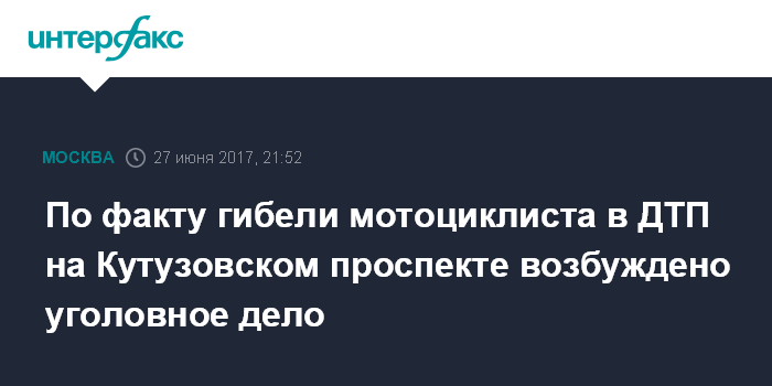 "26 июня в 00 часов 57 минут возле дома 48 Кутузовского проспекта произошло дорожно-транспортное происшествие -столкновение автомобиля Mercedes и мотоцикла Yamaha, под управлением 23-летнего москвича. В результате данного происшествия молодой человек с телесными повреждениями доставлен в городскую клиническую больницу, где позднее от полученных травм скончался",- сказал сотрудник пресс-службы.