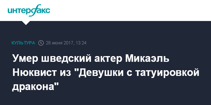 Москва. 28 июня. INTERFAX.RU - Шведский актер Микаэль Нюквист, наиболее известный широкой публике по фильму "Девушка с татуировкой драконом", скончался от рака легких, сообщает в среду агентство Associated Press.