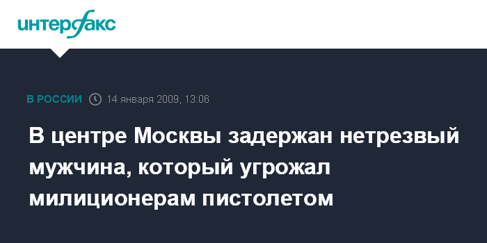 Москва. 14 января. INTERFAX.RU - В сквере в центре Москвы сотрудники милиции задержали нетрезвого мужчину с пистолетом, сообщили "Интерфаксу" в управлении информации и общественных связей ГУВД города в среду.
