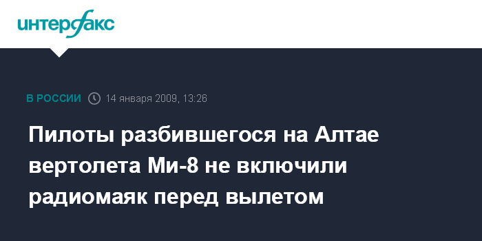 Москва. 14 января. INTERFAX.RU - Радиомаяк, установленный на борту разбившегося 9 января на Алтае вертолета Ми-8, был исправен, но пилоты не включили его перед вылетом, заявил гендиректор и главный конструктор НИИ Космического приборостроения Юрий Королев.