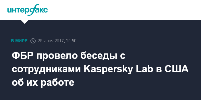 Москва. 28 июня. INTERFAX.RU - Сотрудники ФБР в рамках контрразведывательного расследования провели беседу с рядом сотрудников компании Kaspersky Lab в США по поводу деятельности их компании, сообщает американский телеканал NBC со ссылкой на неназванные источники.