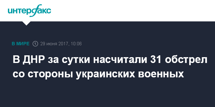 Москва. 29 июня. INTERFAX.RU - За сутки в самопровозглашенной Донецкой народной республике зафиксировали 31 обстрел со стороны Вооруженных сил Украины (ВСУ), погиб мирный житель, заявляют в Донецке.