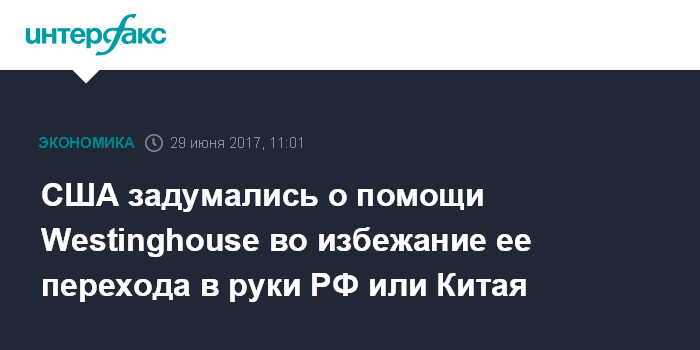 Москва. 29 июня. INTERFAX.RU - Американские власти готовы рассмотреть вопрос об оказании господдержки Westinghouse, чтобы столкнувшийся с финансовыми проблемами производитель атомных технологий не перешел в руки иностранных игроков - компаний из России или Китая, пишет Financial Times со ссылкой на высокопоставленного чиновника Белого дома.