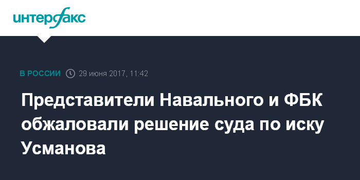 Москва. 29 июня. INTERFAX.RU - Представители оппозиционного политика Алексея Навального и основанного им Фонда борьбы с коррупцией (ФБК) обжаловали решение суда по иску бизнесмена Алишера Усманова о защите чести, достоинства и деловой репутации, сообщила в четверг "Интерфаксу" пресс-секретарь суда Людмила Морозова.