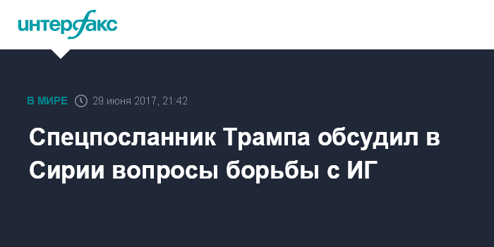 "28-29 июня специальный посланник президента в глобальной коалиции по борьбе с ИГИЛ Бретт МакГерк был в Сирии для консультаций с местными партнерами по вопросу кампании по борьбе с ИГИЛ", - говорится в сообщении ведомства, распространенном в четверг.