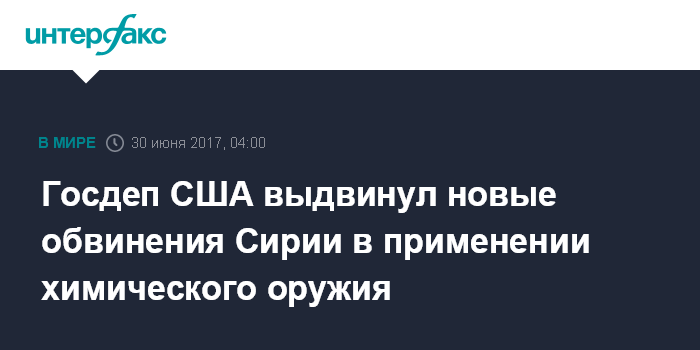 Москва. 30 июня. INTERFAX.RU - Американский госдепартамент заявил, что Сирия не выполнила взятые на себя обязательства по уничтожению химического оружия и продолжает его применять.