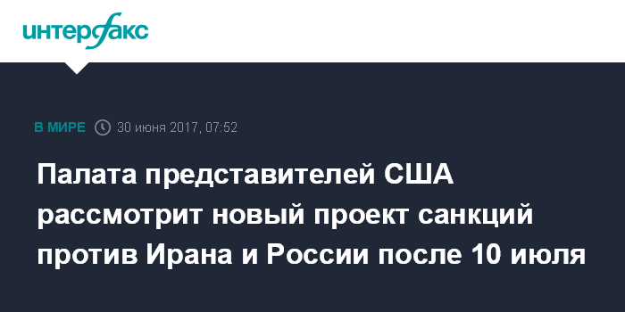 Москва. 30 июня. INTERFAX.RU - Одобренный американским сенатом законопроект о санкциях против Ирана, включающий также санкции против России, может быть рассмотрен палатой представителей после 10 июля, когда в США завершатся празднования по случаю Дня независимости, сообщили СМИ со ссылками на источники из числа законодателей.