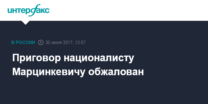 Москва. 30 июня. INTERFAX.RU - Защита обжаловала приговор лидеру националистического движения "Реструкт" Максиму Марцинкевичу, по которому он получил 10 лет колонии строгого режима за нападения на людей, сообщили в пятницу "Интерфаксу" в пресс-службе Бабушкинского суда Москвы.