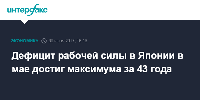 Данные говорят об усиливающихся проблемах японской экономики в связи со старением и сокращением населения. Число предложений работы в прошлом месяце снизилось на 0,1%, но количество претендующих на них японцев сократилось намного заметнее - на 0,9%. Больше всего сотрудников не хватает в промышленности, на транспорте и на почте.