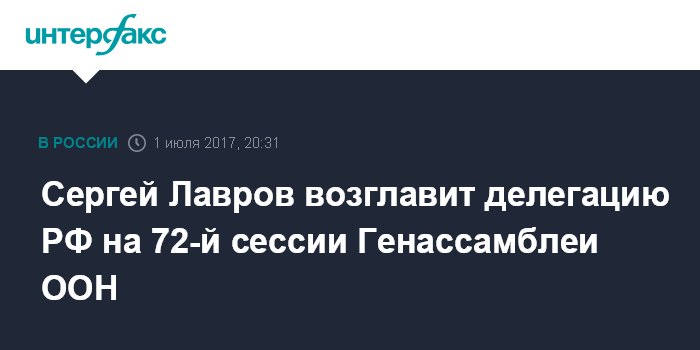 Москва. 1 июля. INTERFAX.RU - Министр иностранных дел России Сергей Лавров возглавит делегацию РФ на 72-й сессии Генеральной ассамблеи ООН, говорится в распоряжении президента РФ Владимира Путина, опубликованном в субботу.