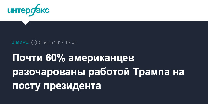 Москва. 3 июля. INTERFAX.RU - Рейтинг неодобрения президента США Дональда Трампа достиг 57%, свидетельствует опрос, проведенный исследовательской компанией Gallup.
