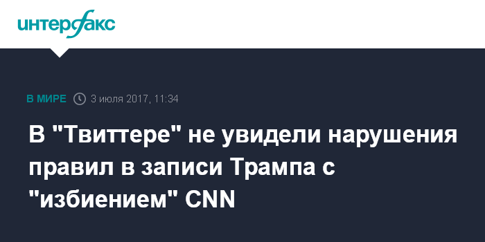 Москва. 3 июля. INTERFAX.RU - В руководстве "Твиттера" заявили, что запись президента США Дональда Трампа с избиением человека с логотипом телеканала CNN вместо головы, не нарушает правил соцсети. Такой ответ там дали на запрос CNN.