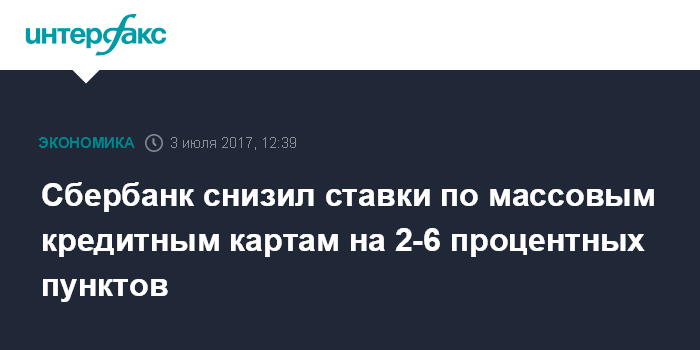 Москва. 3 июля. INTERFAX.RU - Сбербанк России с 1 июля снизил ставки по массовым кредитным картам на 2-6 процентных пунктов, говорится в пресс-релизе банка.