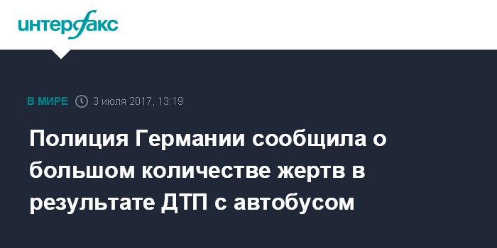 Москва. 3 июля. INTERFAX.RU - Полиция Германии в понедельник сообщила о большом количестве жертв в результате ДТП с туристическим автобусом. Об этом сообщает агентство The Associated Press.