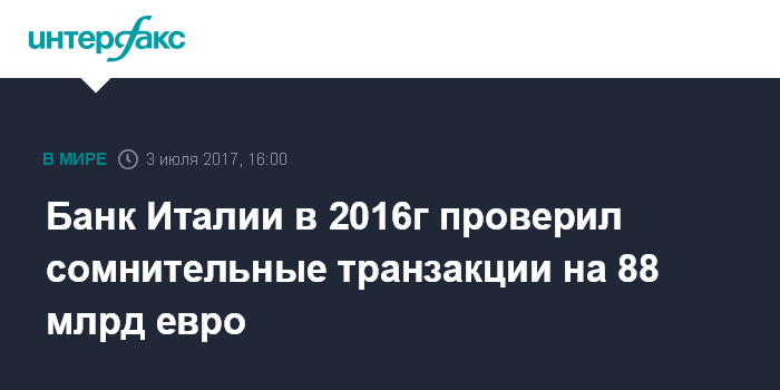 Москва. 3 июля. INTERFAX.RU - Банк Италии в 2016 году провел проверки более 100 тысяч подозрительных и сомнительных транзакций на сумму свыше 88 млрд евро, заявил глава ЦБ Игнацио Виско на пресс-конференции в Риме.