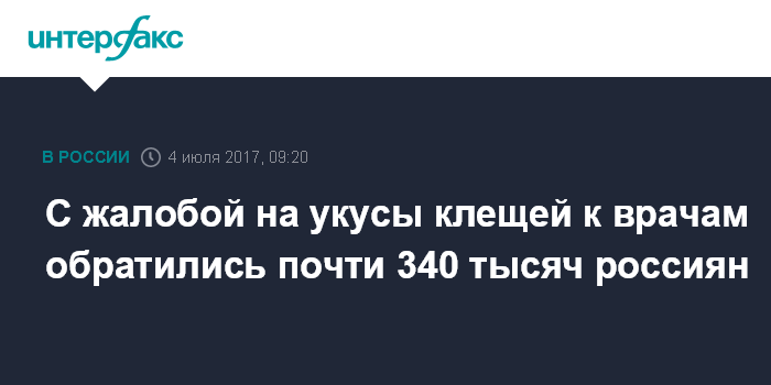 Москва. 4 июля. INTERFAX.RU - Более 338 тысяч человек обратились в медицинские организации с жалобой на укусы клещей, сообщает пресс-служба Роспотребнадзора.