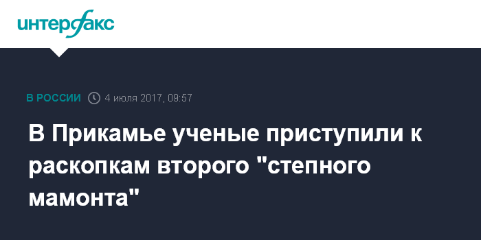 Москва. 4 июля. INTERFAX.RU - Палеонтологи во вторник выехали в Оханский район Пермского края, где они планируют извлечь кости второго трогонтериевого слона, обнаруженного летом 2016 года, сообщается на сайте администрации губернатора региона.
