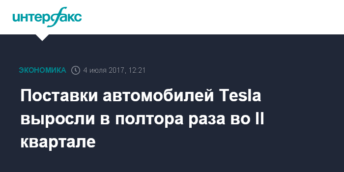 Москва. 4 июля. INTERFAX.RU - Американский производитель электромобилей Tesla во втором квартале 2017 года увеличил поставки автомобилей на 53% в годовом выражении, до 22 тысяч машин, говорится в сообщении компании.