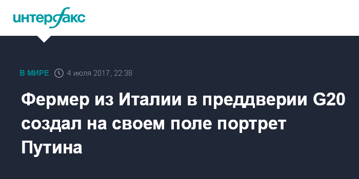 Москва. 4 июля. INTERFAX.RU - Итальянский фермер Дарио Гамбарин при помощи трактора и плуга изобразил на своем поле близ Вероны президента России Владимира Путина, сообщила во вторник итальянская пресса.