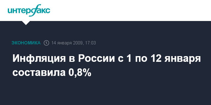 Москва. 14 января. INTERFAX.RU - Инфляция в РФ с 1 по 12 января 2009 г. составила 0,8%, сообщил Росстат в среду.
