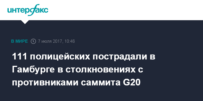 Москва. 7 июля. INTERFAX.RU - По меньшей мере 111 сотрудников полиции получили в четверг ранения и травмы в ходе столкновений с участниками демонстраций, протестовавшими против проведения саммита G20, сообщает в пятницу немецкое телевидение.