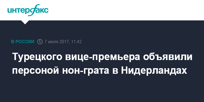 Москва. 7 июля. INTERFAX.RU - Правительство Нидерландов объявило в пятницу "персона нон-грата" турецкого вице-премьера Тугрула Тюркеша, который намеревался посетить церемонию, приуроченную к годовщине неудавшегося переворота в Турции, которую намерены провести проживающие в этой стране турки.