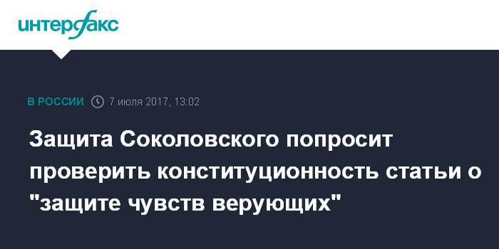 Москва. 7 июля. INTERFAX.RU - Адвокат екатеринбургского блогера Руслана Соколовского, осужденного за оскорбление чувств верующих, Алексей Бушмаков намерен обратиться в Конституционный суд РФ, чтобы тот проверил на конституционность данную статью Уголовного кодекса РФ.