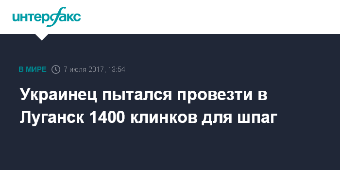 Москва. 7 июля. INTERFAX.RU - На контрольно пропускном пункте въезда-выезда "Станица Луганская" несшие службу украинские пограничники и работники фискальной службы обнаружили у направлявшегося на неподконтрольную властям Украины территорию гражданина 1,4тыс. клинков для фехтовальных шпаг.