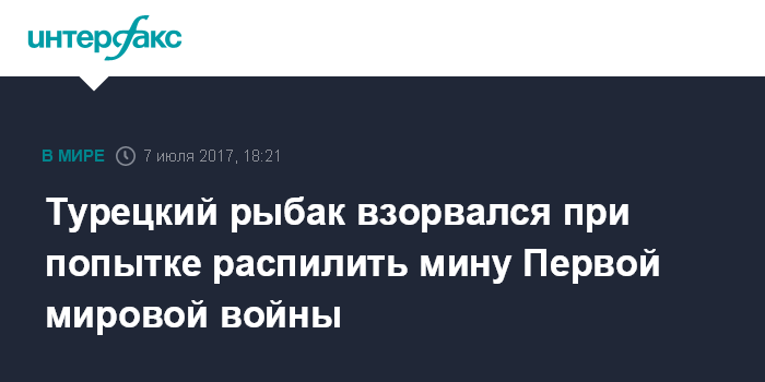 Москва. 7 июля. INTERFAX.RU - 73-летний рыбак из Турции взорвался, пытаясь распилить пушечный снаряд времен Первой мировой войны, пишет The Hurriyet.
