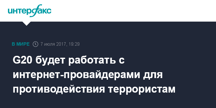 Москва. 7 июля. INTERFAX.RU - Лидеры G20 заявили о намерении работать с интернет-провайдерами для противодействия использованию сети в террористических целей.