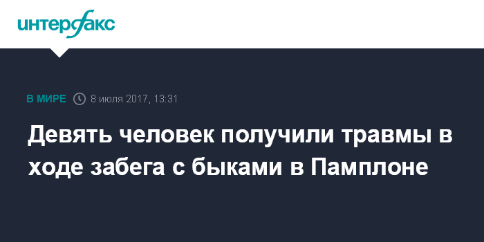 Москва. 8 июля. INTERFAX.RU - Девять человек получили травмы разной степени тяжести после второго забега с 12 разъяренными быками на фиесте в испанской Памплоне, сообщает в субботу агентство Associated Press.