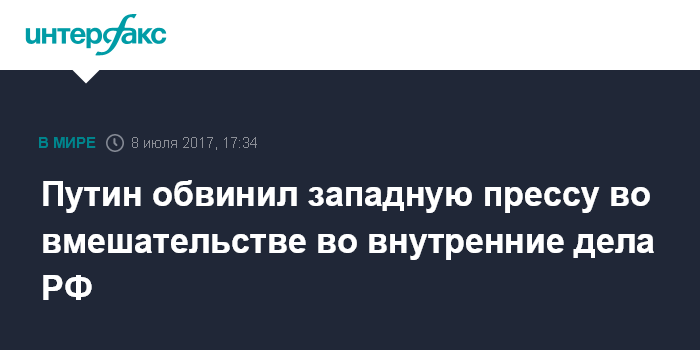 Москва. 8 июля. INTERFAX.RU - Западная пресса постоянно вмешивается во внутренние дела России, но Москва относится к этому спокойно, заявил президент РФ Владимир Путин на пресс-конференции по итогам саммита G20 в Гамбурге.
