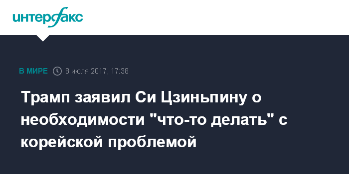 Москва. 8 июля. INTERFAX.RU - Президент США Дональд Трамп заявил председателю КНР Си Цзиньпину о необходимости предпринимать шаги по решению северокорейской проблемы, сообщают в субботу европейские СМИ.