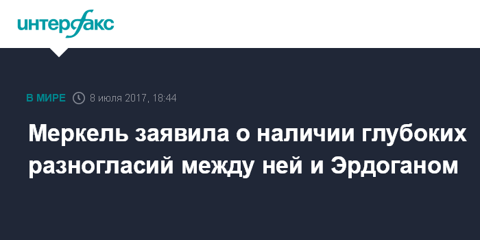Москва. 8 июля. INTERFAX.RU - Канцлер Германии Ангела Меркель заявила в ходе пресс-конференции в Гамбурге о сохранении несогласия с позицией президента Турции Реджепа Тайипа Эрдогана по ряду вопросов по итогам двусторонних переговоров в рамках G20.