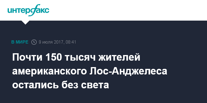 Москва. 9 июля. INTERFAX.RU - Около 140 тысяч жителей американского города Лос-Анджелеса остались без электричества в результате пожара на одной из электрических подстанций, сообщило руководство города.