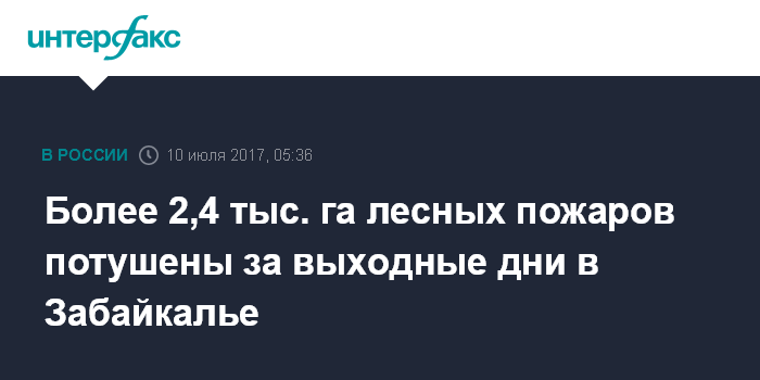 Москва. 10 июля. INTERFAX.RU - В Забайкальском крае за выходные дни потушено 11 лесных пожаров общей площади более 2,4 тыс. га в в Балейском, Красночикойском, Нерчинско-Заводском, Сретенском, Чернышевском и Могочинском районах, сообщает пресс-служба регионального Минприроды.