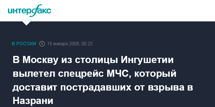 Москва. 15 января. ИНТЕРФАКС - Самолет МЧС России Ил-76, с ранеными на борту, вылетел из столицы Ингушетии в Москву.