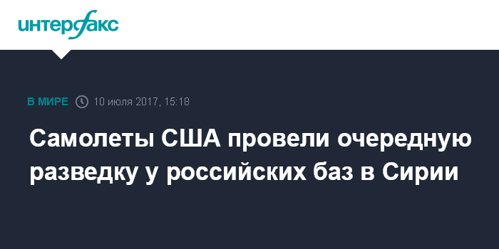 Москва. 10 июля. INTERFAX.RU - Сразу два американских военных самолета в понедельник совершили очередные разведывательные полеты вблизи побережья Сирии и российской военно-морской базы в сирийском порту Тартус и авиабазы Хмеймим. Об этом свидетельствуют данные западных сайтов, отслеживающих передвижения военной авиации.