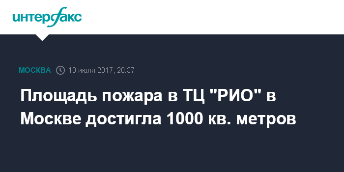 Москва. 10 июля. INTERFAX.RU - Площадь пожара в ТЦ "РИО" на Дмитровском шоссе в Москве, по предварительной информации, составляет около 1000 квадратных метров, сообщили "Интерфаксу" в пресс-службе столичного МЧС.