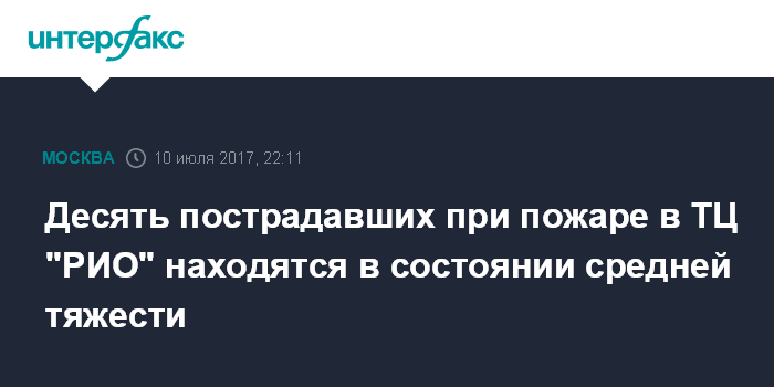 Москва. 10 июля. INTERFAX.RU - Состояние десяти пострадавших в результате пожара в торговом центре "Рио" на Дмитровском шоссе в Москве оценивается как среднетяжелое, сообщил "Интерфаксу осведомленный источник.