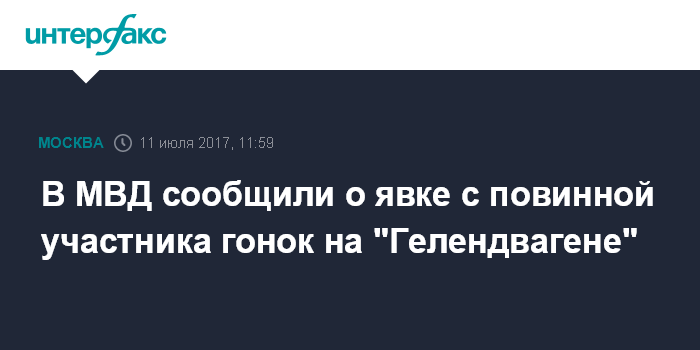 Москва. 11 июля. INTERFAX.RU - Четвертый участник гонок на "Гелендвагене" явился с повинной в полицию, сообщили "Интерфаксу" во вторник в пресс-службе столичного главка МВД.