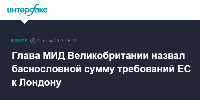Москва. 11 июля. INTERFAX.RU - Глава МИД Великобритании Борис Джонсон во вторник заявил, что ЕС требует неоправданно большую сумму от Лондона за Brexit. "Сумма, которую я видел, кажется мне баснословной", - приводят британские СМИ слова Джонсона.