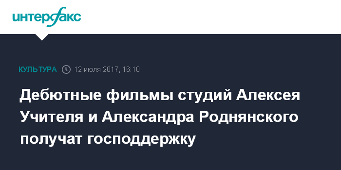 Москва. 12 июля. INTERFAX.RU - Министерство культуры РФ по итогам презентаций кинопроектов приняло решение оказать господдержку 12 фильмам режиссеров-дебютантов, в том числе картинам студий Алексея Учителя и Александра Роднянского.