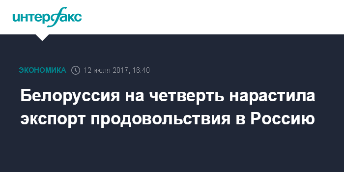 Москва. 12 июля. INTERFAX.RU - Экспорт белорусского продовольствия в Россию вырос в 2017 году на 28%, сообщил журналистам заместитель премьер-министра Белоруссии Михаил Русый перед встречей с президентом Молдавии Игорем Додоном в среду в Минске.