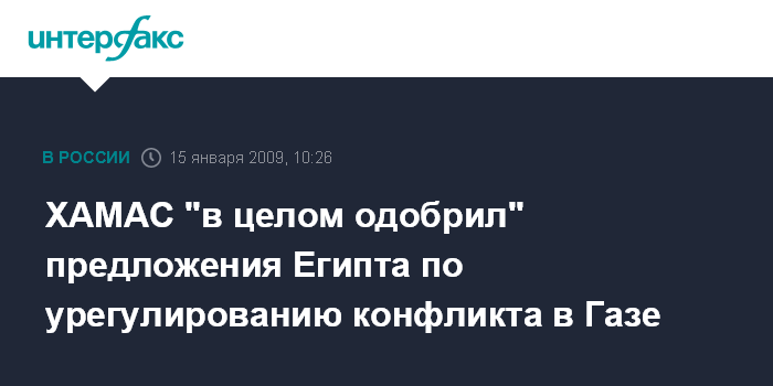 Москва. 15 января. INTERFAX.RU - Представители движения ХАМАС заявили, что они "в целом одобрили" план по прекращению огня в секторе Газа, предложенный Египтом, и в настоящее время ожидают ответа израильской стороны, сообщает газета "Джерузалем пост".