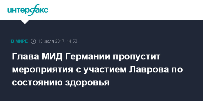 "По состоянию здоровья глава МИД ФРГ не сможет принять участие в российско-германских двусторонних мероприятиях, запланированных в Берлине", - сказал журналистам источник.